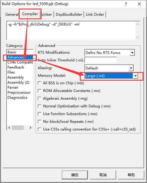 将"Compiler"->"Advanced"中的"Memory Model"改成“Large (-ml)”:
