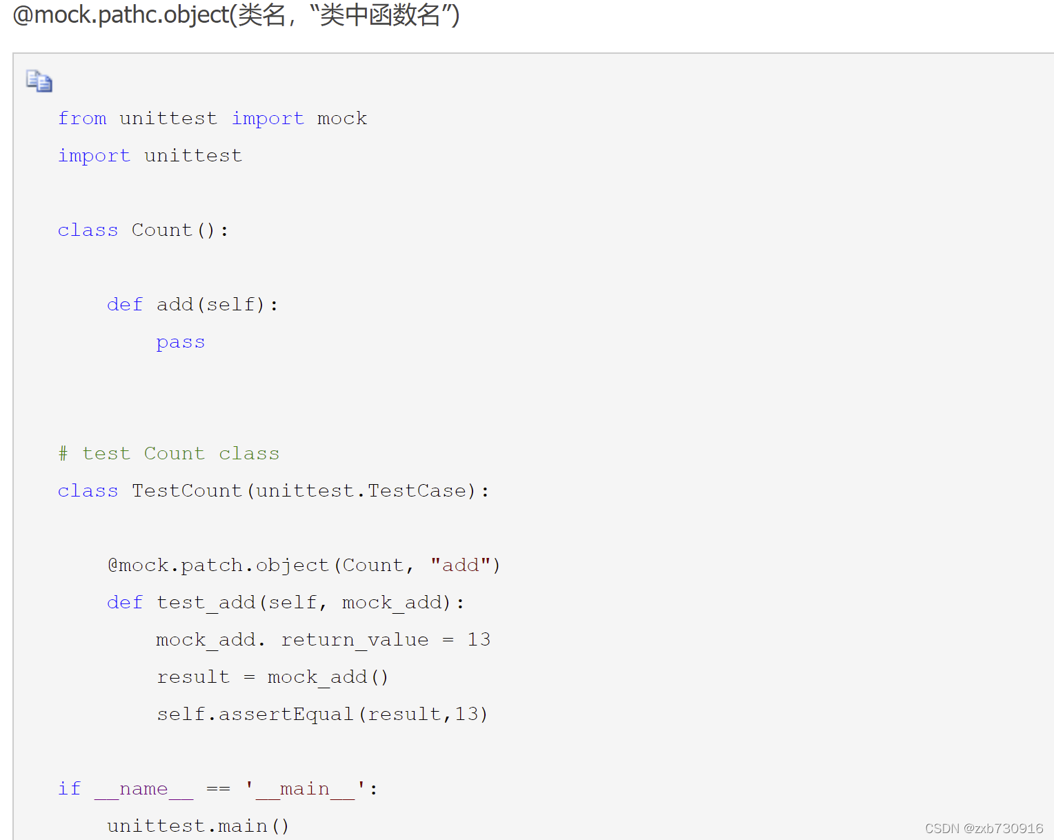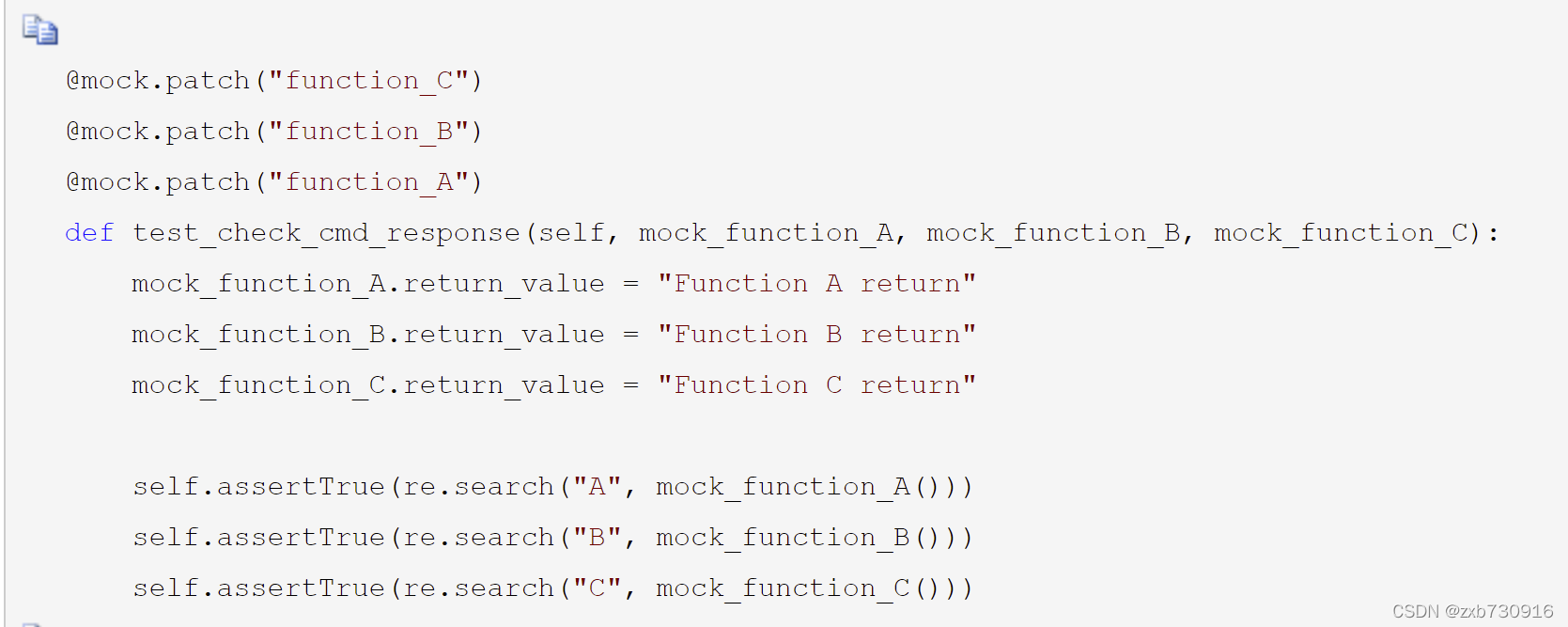 它是一个装饰器,需要把你想模拟的函数写在里面,然后在后面的单元测试案例中为它赋一个具体实例,再用 return_value 来指定模拟的这个函数希望返回的结果就可以了