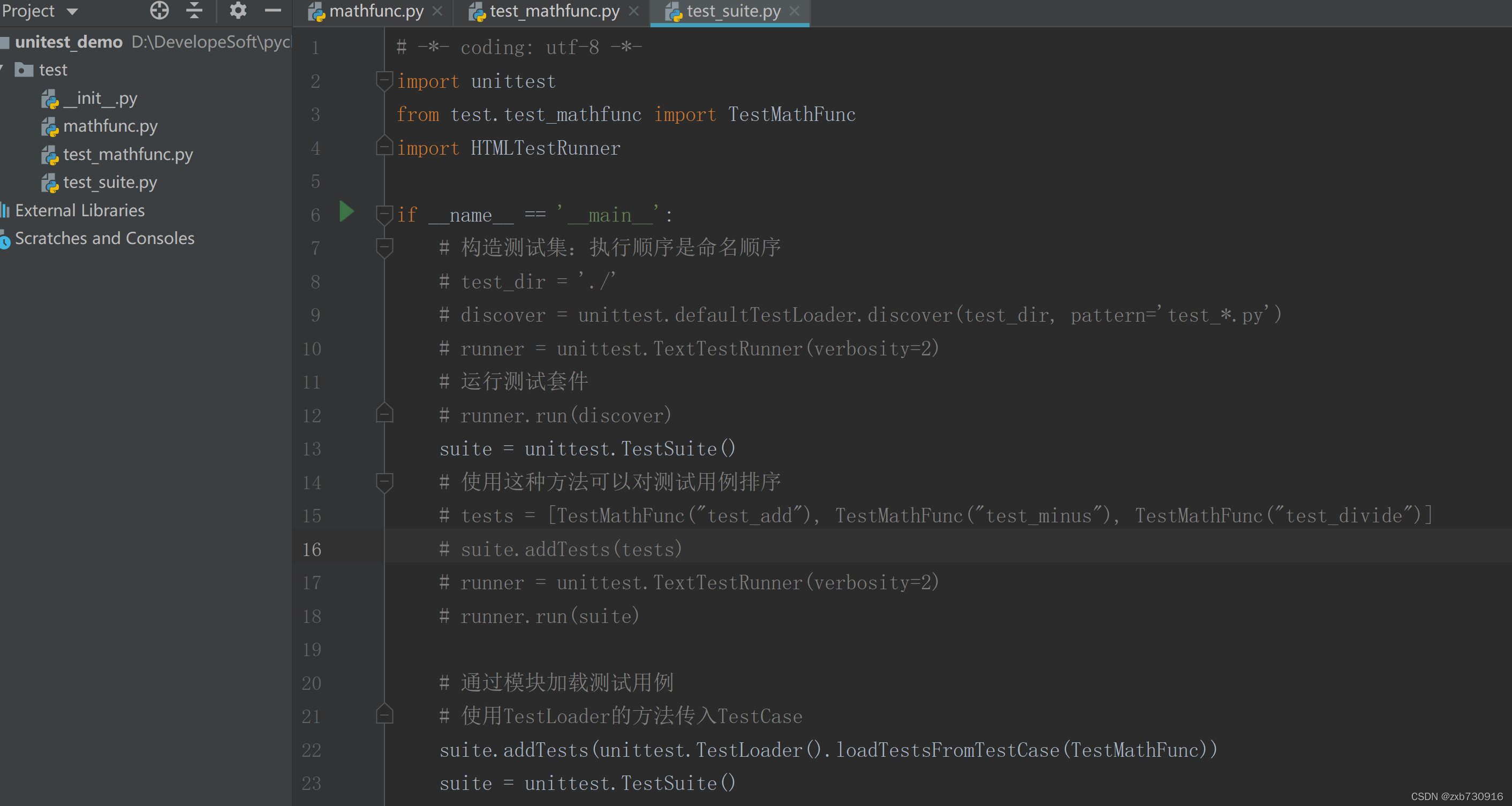 unittest最核心的四部分是:测试用例TestCase,测试套件TestSuite,测试运行器TestRunner,测试脚手架TestFixture