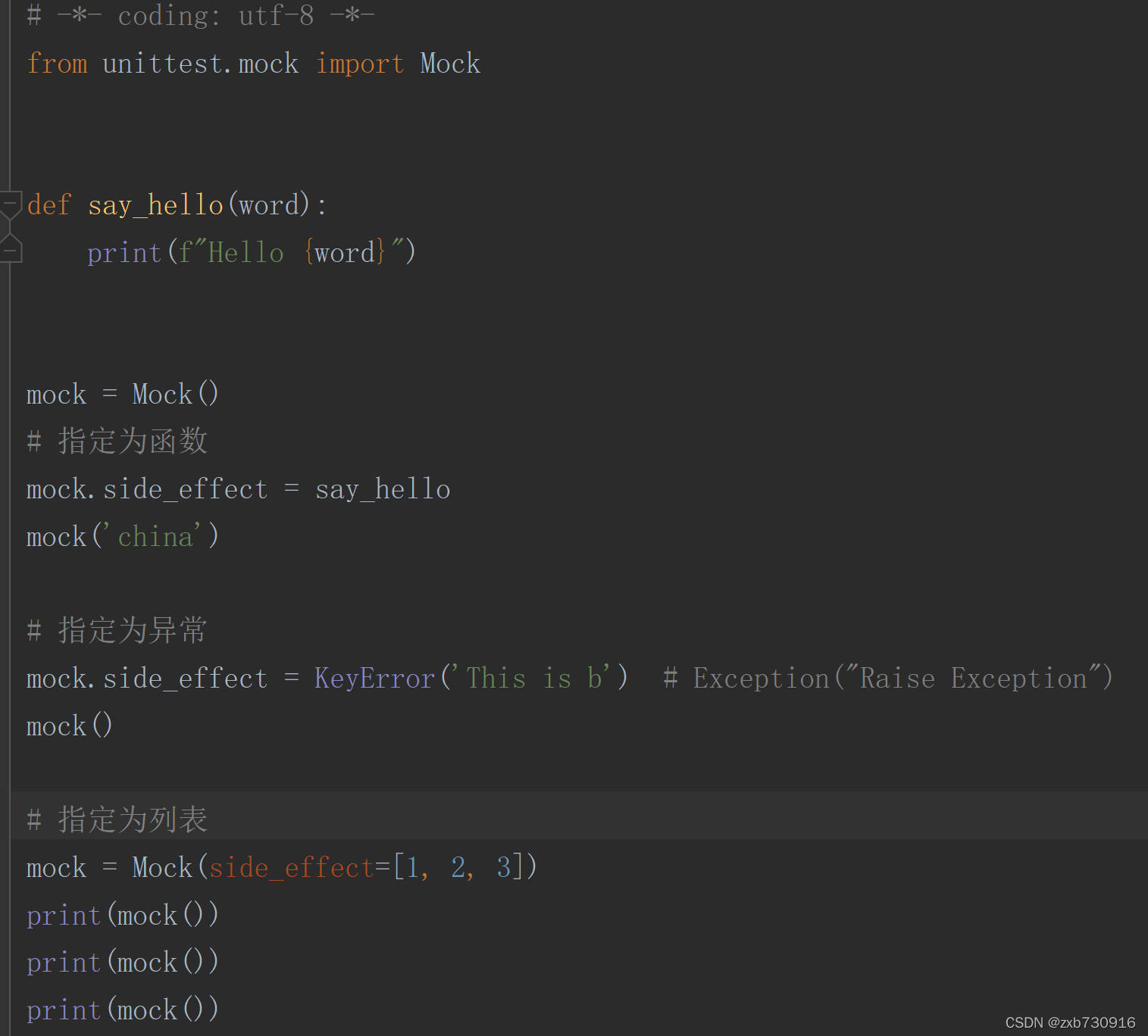 mock 对象的side_effect 的作用:通过side_effect指定mock对象的副作用,这个副作用就是当你调用这个mock对象时会调用的函数,也可以选择抛出一个异常,来对程序的错误状态进行测试,指定为list等