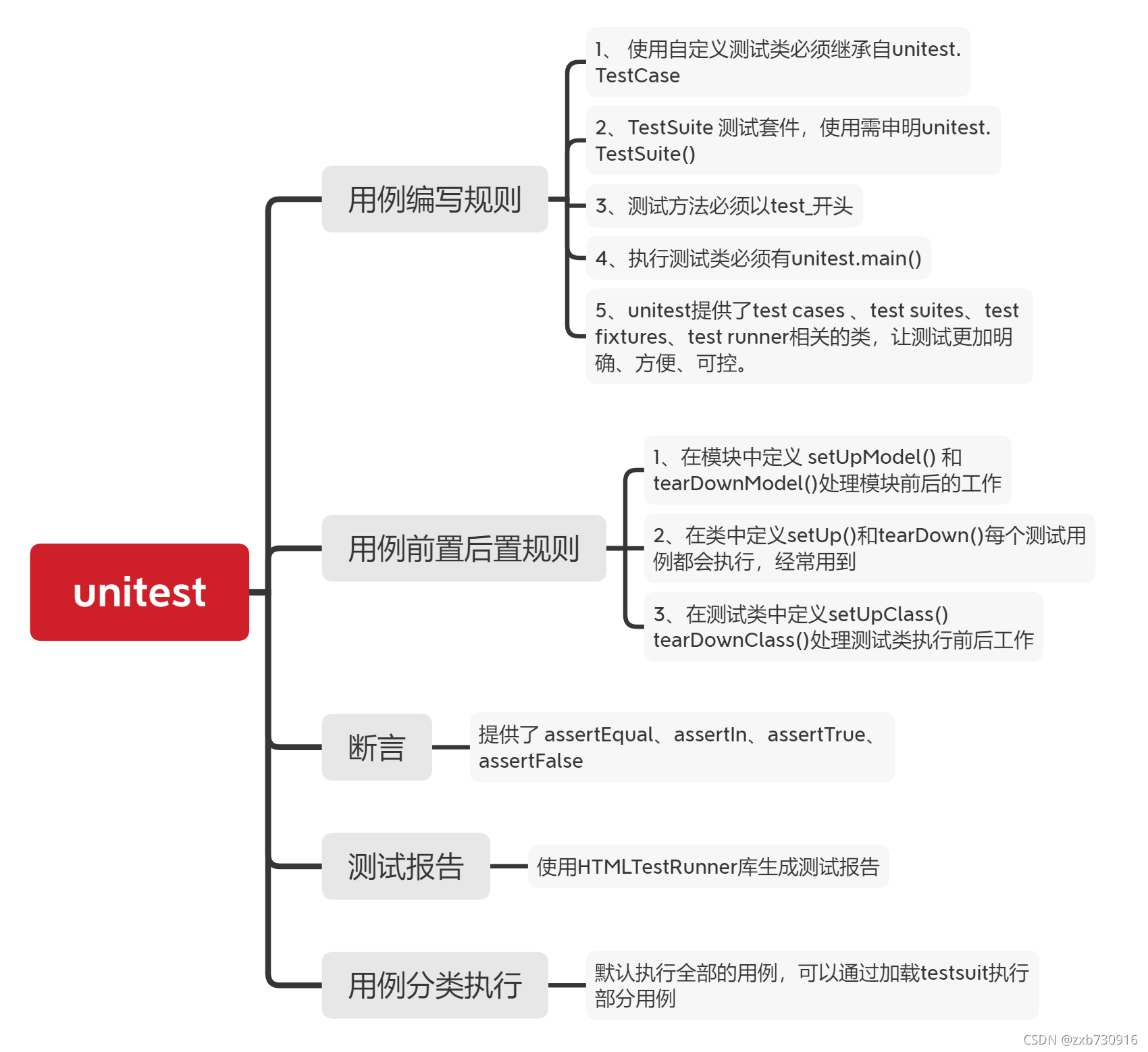整个的流程就是首先要写好TestCase,然后由TestLoader加载TestCase到TestSuite,然后由TestTestRunner来运行TestSuite,运行的结果保存在TextTestReusult中,整个过程集成在unittest.main模块中。