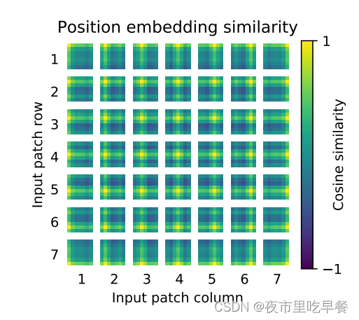 每一个都是同行同列的这个相似度更高,意味着虽然他是1d的位置编码,但是它已经学到了2d图像的这种距离的概念,所以作者在文中也说了,这也可以解释,为什么换成2d的位置编码以后,并没有得到效果的提升,是因为1d的已经够用了