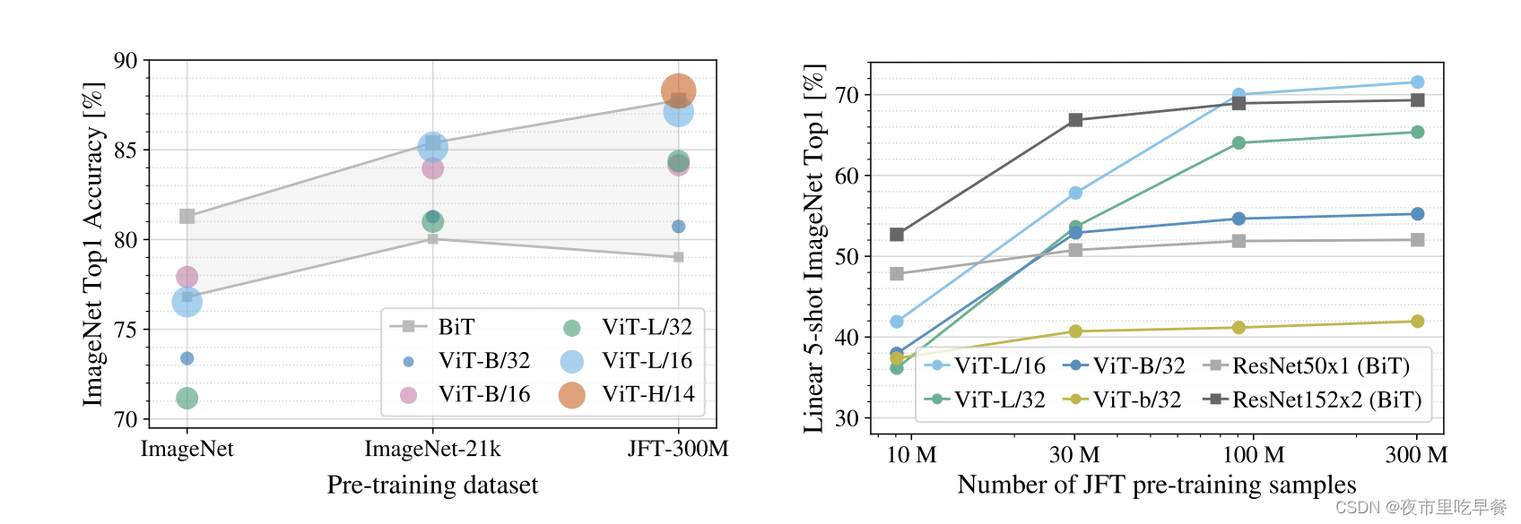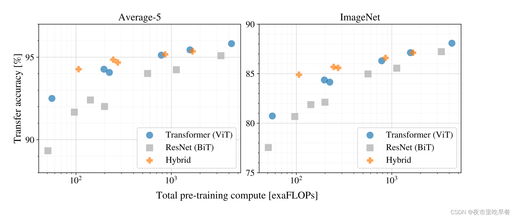 蓝色是Vit,灰色是Resnet,橙色是混合模型,前面是卷积神经网络,后边是Transformer,图里大大小小的点,其实是各种配置下大小不一样的Vision Transformer的各种变体,或者说是Resnet的变体,这两张图里所有的模型都是在JFT 300million的这个数据集上去训练的,作者不想让魔性的能力受限于数据集的大小,所以说,所有的模型都在最大的数据集上去做预训练,我们可以看到几个比较有意思的现象,如果我们拿蓝色的圈圈去跟灰色Resnet相比,我们会发现在同等的计算复杂度的情况下,一般Transformer要比resnet要好的,这个证明他们所说的训练一个vision Transformer是要比一个训练一个卷积神经网络要便宜的
