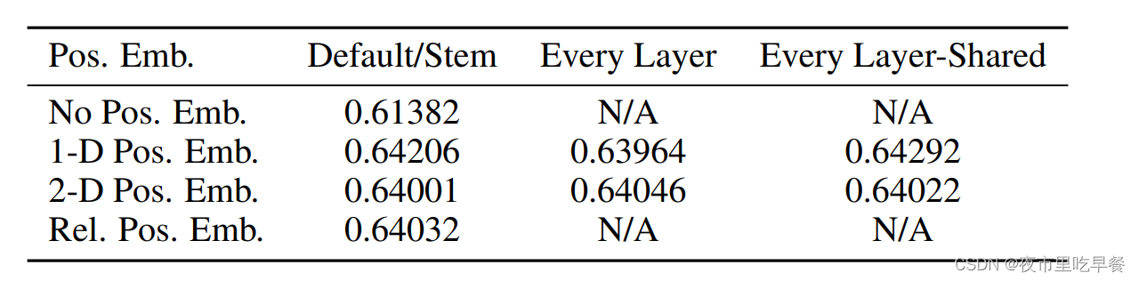 如果我们来对比三种位置编码的,我们会发现所有的Performance都是64%,没有任何区别,这个现象其实还比较奇怪,作者在后边,也给出他们认为比较合理的解释,他们说这个vision Transformer是直接在图像块上去做的,而不是在原来得这个像素块做的,因为图像块很小,比如14*14,而不是全局的224*224,所以我们去排列组合这种小块,或者我们想知道这些小块之间的相对位置信息还是比较容易的,所以我们用什么位置编码都无所谓。