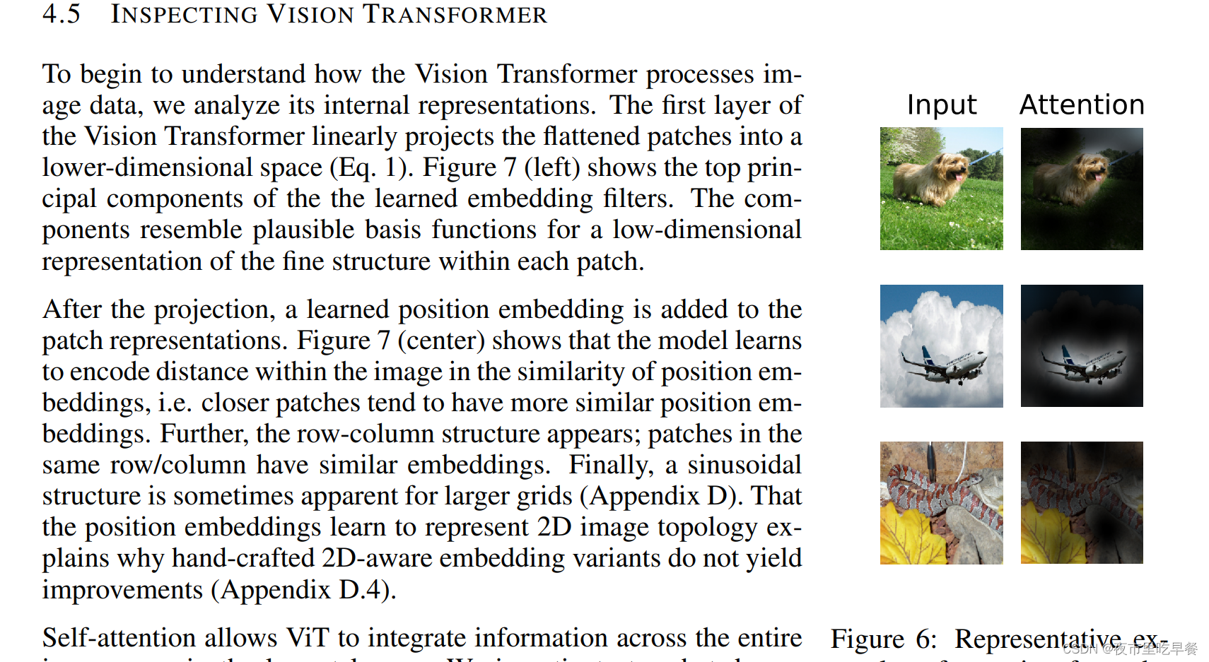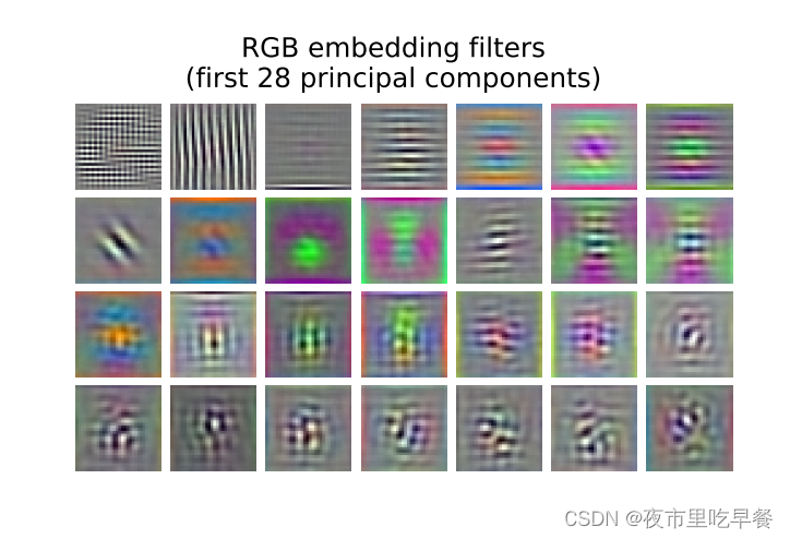 展示了大E是如何embed rgb value的,这里只是展示了头28个,其实vision transformer学到的跟卷积神经网络的很像,都是这种像gabor filter的这种,有一些颜色还有一些纹理,所以作者说这些成分是可以当做这个基函数的,也就是说可以去描述每一个图像块的这种底层的结构,看完patch embedding。我们来看一下positional embedding,位置编码如何工作