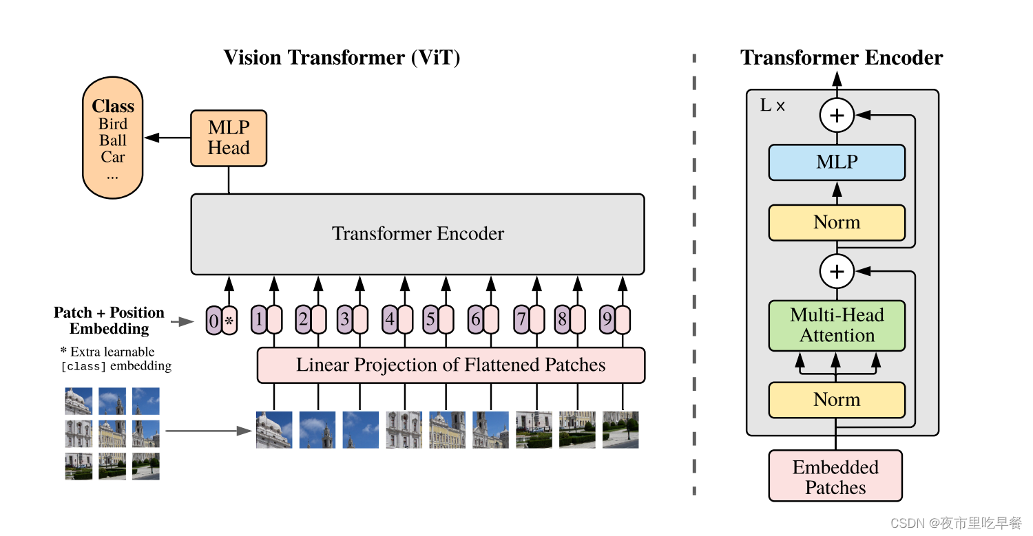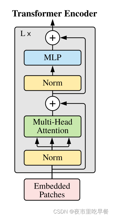 MLP head其实就是一个通用的分类头,最后用交叉熵函数去进行模型的训练,Transformer encoder也是一个标准Transformer,如下图,当我们有这些patch的时候