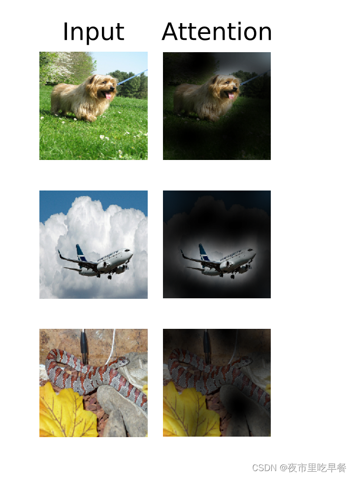 这里面,是用网络最后一层output token去做的这些图,发现如果用输出的token这个自注意力折射回原来的这个输入图片,我们其实可以看到他真的学到了概念,比如说第一个里面的这个狗,它已经注意到了狗,还有这个飞机