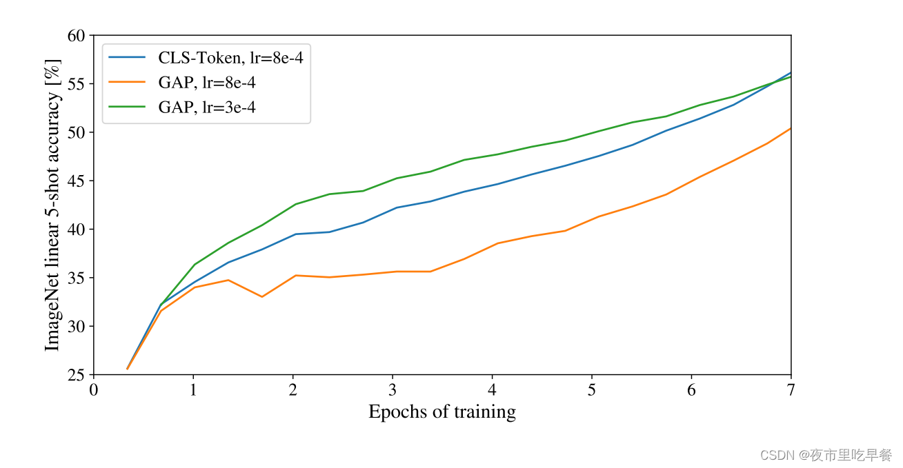 绿线代表全局平均池化,原来vision领域里是如何做的,class token代表NLP是如何做的-蓝线,我们可以看到其实最后绿线和蓝线效果是一样的,但是作者指出,绿线和蓝线用的学习率是不一样的,我们需要好好来调参数,如果不好好调参,直接把class token用的学习率直接拿过来去做全局平均池化的话,效果是非常差的,所以有时候不是我们的idea不行,可能主要还是参没调好,炼丹技术还是要过硬。