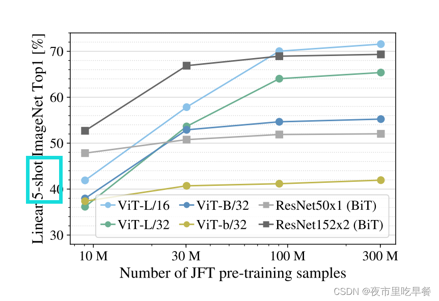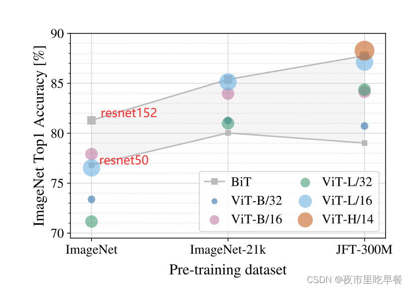 这个图应该是整个Vision Transformer论文最重要的take home message,最想要我们知道的,这张图的意思是当我们使用大小不同的数据集的时候,比如说ImageNet是1.2 million,ImageNet-21k是14million,JFT是300million,当数据集不断增大的时候,resnet和vit到底在ImageNet的fine-tune的时候效果如何,灰色代表bit