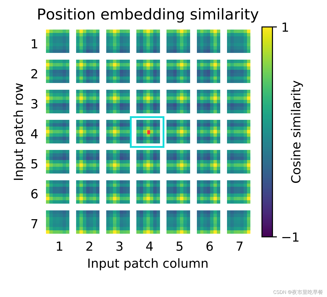 这个画的是位置编码的相似性,相似性越高是1,相似性越低是-1,因为它做的是cosine similarity,他的横纵坐标分别是对应的patch,首先我们来看,同一个patch,自己跟自己比,那这个相似性很定是最高的,接下来我们观察到,这个学到的位置编码真的可以表示一些这个距离的信息的,假如我们看这个
