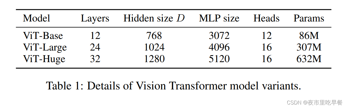 一共有三种模型,其实跟Transformer那边是对应的,有base、large、huge,对应的参数全都逐渐的变大,比如说用了更多地Transformer block,或者用了更长的向量维度,或者MLP的size变大,或者多头自注意力用了更多地头