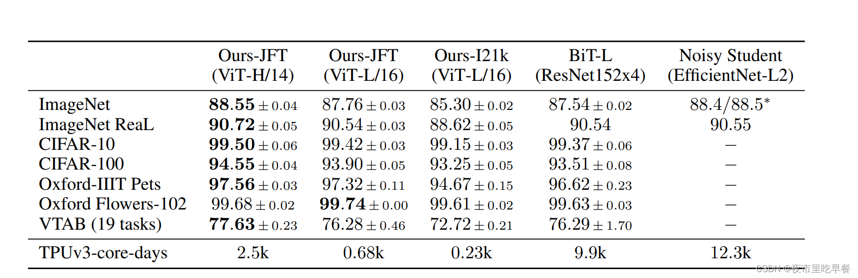 已经在大规模的数据集上进行预训练了,然后在这么多数据上去做fine-tune(微调)时候得到的表现,这里先对比了几个Vit的变体,比如vit的huge model就是最大的那个模型,全部取得了最好的结果,跟卷积神经网络Bit和noisy student来进行对比,跟bit做对比的原因,因为bit确实是卷积神经网络里做的比较大的,而且也因为这个作者团队自己本身的工作,所以真好可以那俩进行比较,所以之前做的数据集,bit也都做过,至于noisy student是因为他是ImageNet之前表现最好的方法,他用的方式是用pseudo-label为伪标签去进行self-training,就是用伪标签也取得掉了很好的效果。