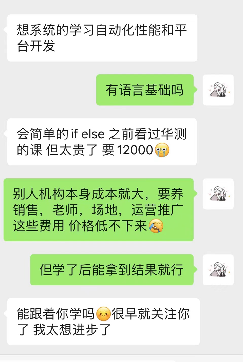 另外因为自己没有销售、运营、场地等的成本费用(啥都是我一个人)所以我的定价肯定比机构会便宜不少(机构三分之一的费用)。
