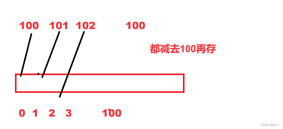 但是如果我们的数是100~ 200实际只有100个数,如果按照绝对映射的办法就要开辟200个数据空间就会造成浪费:解决办法就是: