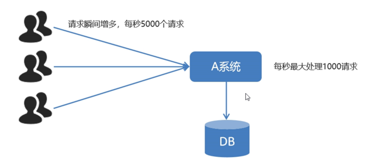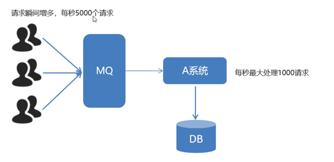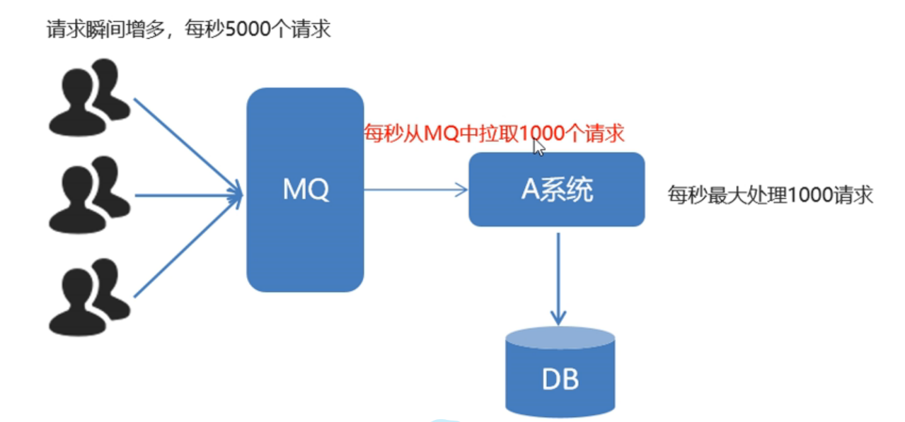 对于以上的情况可以使用MQ来解决,用户的大量请求不再直接与系统对接,而是与MQ对接。然后大量消息进入队列。