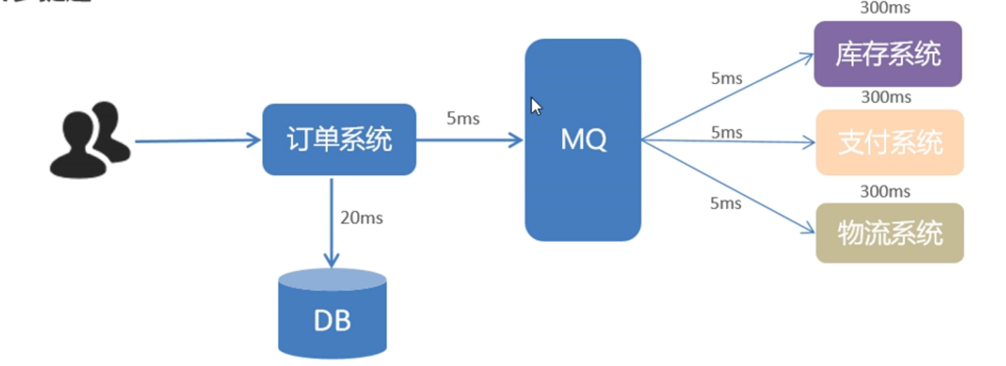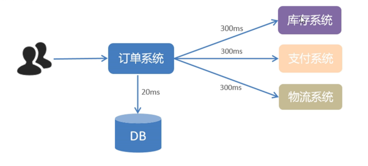 当用户下完单以后,订单系统需要在数据库中保存订单信息到订单表花费20ms,然后订单系统首先在库存系统操作并返回结果到订单系统花费300ms,支付系统和物流系统同意也各自花费300ms。这样就花费300+300+300+20=920ms后订单系统才能将结果返回给用户,延时太长