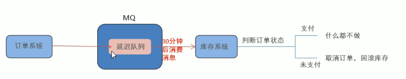 当订单系统下单后,发送一条消息给MQ,然后MQ收到消息设置30分钟后消费消息。当到30分钟时候,将这条消息发送给库存系统,判断订单是否支付,如果支付了就不做什么,如果未支付,那么就取消订单,回滚库存。