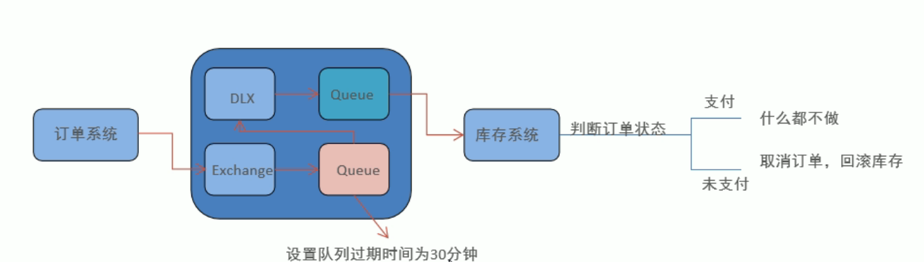 如上图,当订单系统下完订单发送消息给队列,这条消息的TTL时间设置为30分钟。当30分钟后该消息过期了进入死信交换机,死信交换机将该过期消息发送给私信队列,最后死信队列将过期消息发送给库存系统提醒库存系统进行判断该订单是否支付。