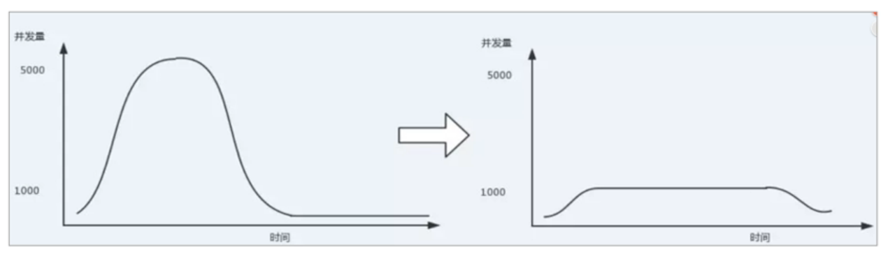 使用了MQ之后,限制消费消息的速度为1000,这样一来,高峰期产生的数据势必会被积压在 MQ 中,高峰就被“削”掉了,但是因为消息积压,在高峰期过后的一段时间内,消费消息的速度还是会维持在1000,直到消费完积压的消息,这就叫做“填谷”