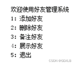 如今的社交软件层出不穷,虽然功能千变万化,但都具有好友管理系统的基本功能,包括添加好友、删除好友、备注好友、展示好友等。下面是一个简单的好友管理系统的功能菜单,如图1所示。