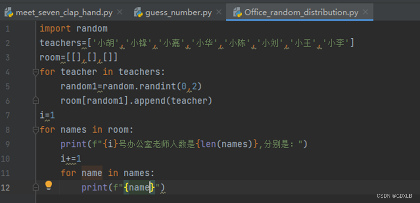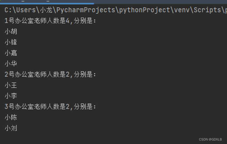 本实例要求编写程序,将8名教师随机分配到3个办公室中。