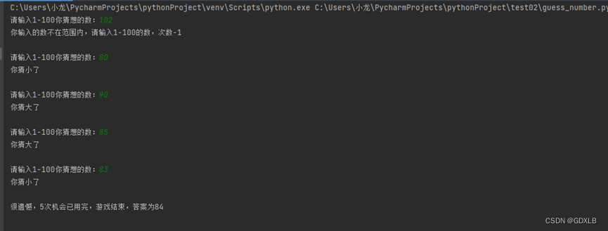 (8)当玩家猜测5次后,仍没有猜对,结束程序