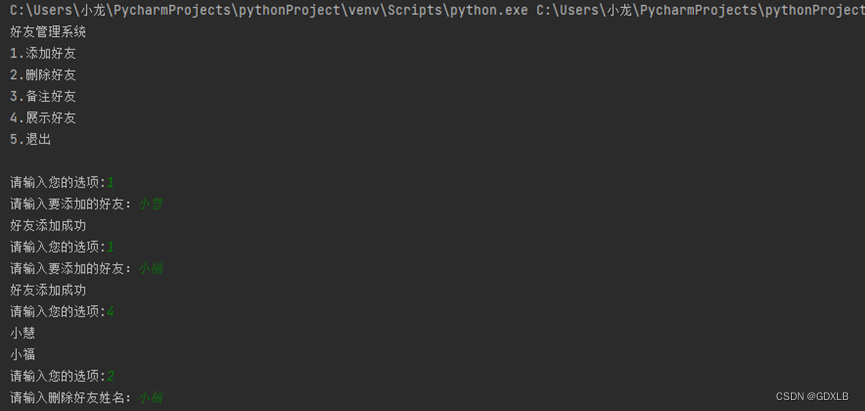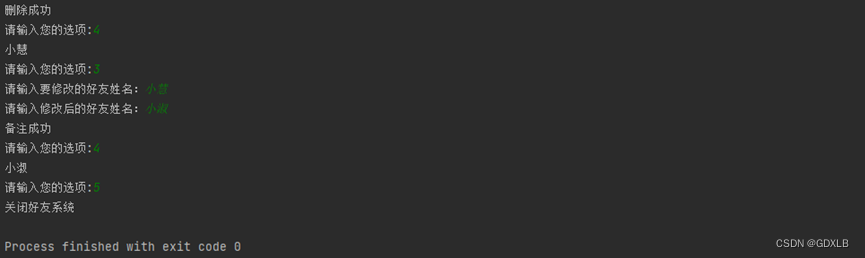 - 删除好友:用户根据提示“请输入删除好友姓名:”输入要删除好友的姓名,删除后提示“删除成功”。