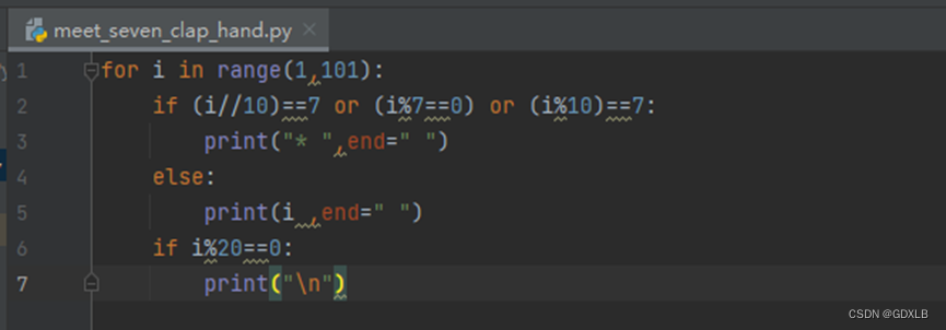 逢7拍手游戏的规则是:从1开始顺序数数,数到有7或者包含7的倍数的时候拍手。本实例要求编写程序,模拟实现逢七拍手游戏,输出100以内需要拍手的数字。运行代码,控制台输出结果如下: