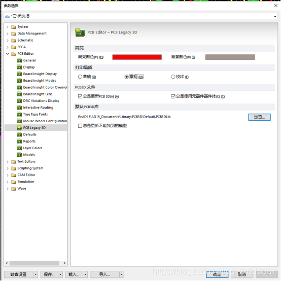 在三维效果图窗口中执行“工具”->“优先选项”命令,将打开“参数选择”对话框中的PCB Editor-PCB Legacy 3D选项。