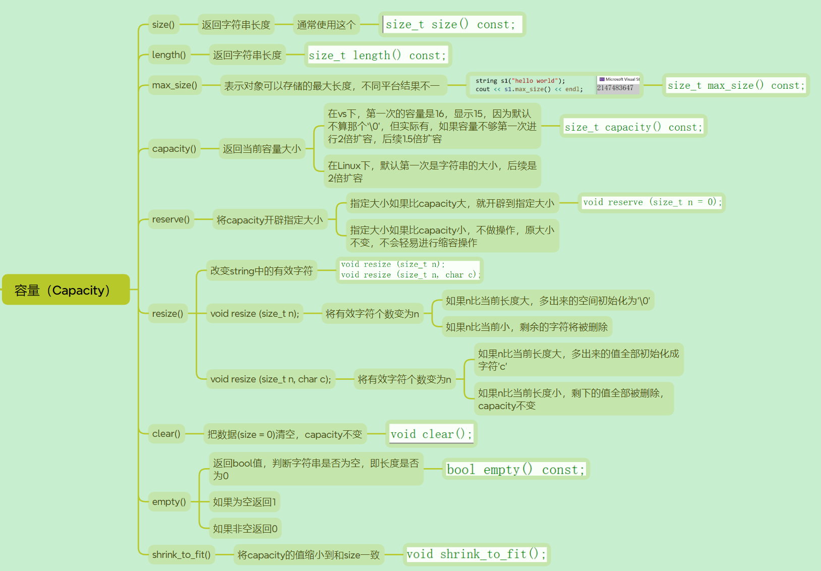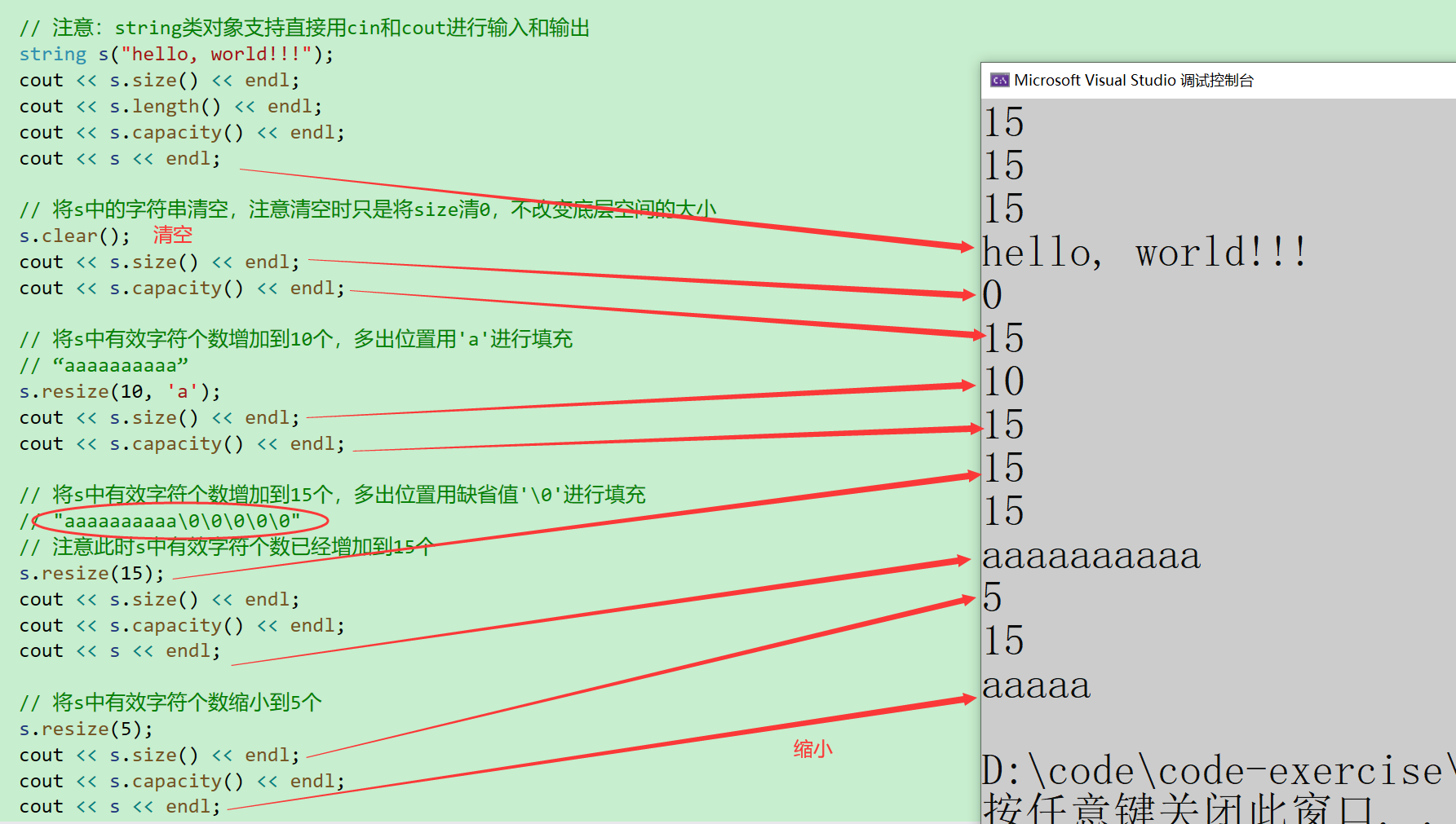 - resize(size_t n) 与 resize(size_t n, char c)都是将字符串中有效字符个数改变到n个,不同的是当字 符个数增多时:resize(n)用0来填充多出的元素空间,resize(size_t n, char c)用字符c来填充多出的 元素空间。注意:resize在改变元素个数时,如果是将元素个数增多,可能会改变底层容量的大小,如果是将元素个数减少,底层空间总大小不变。
