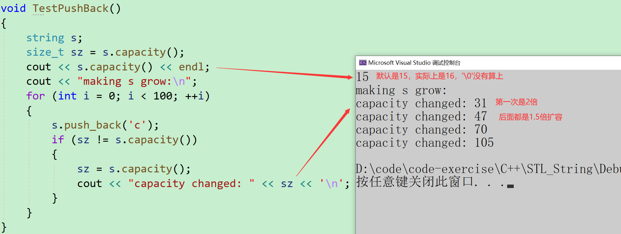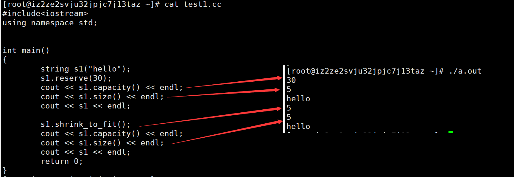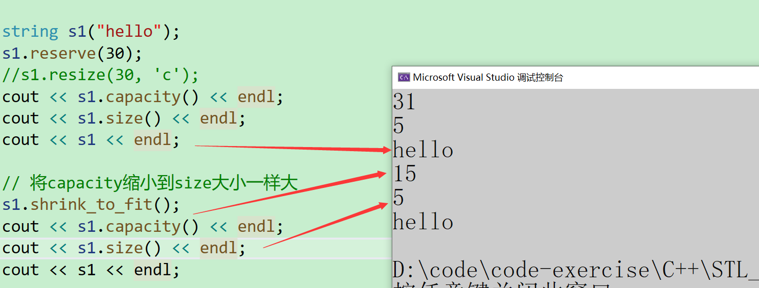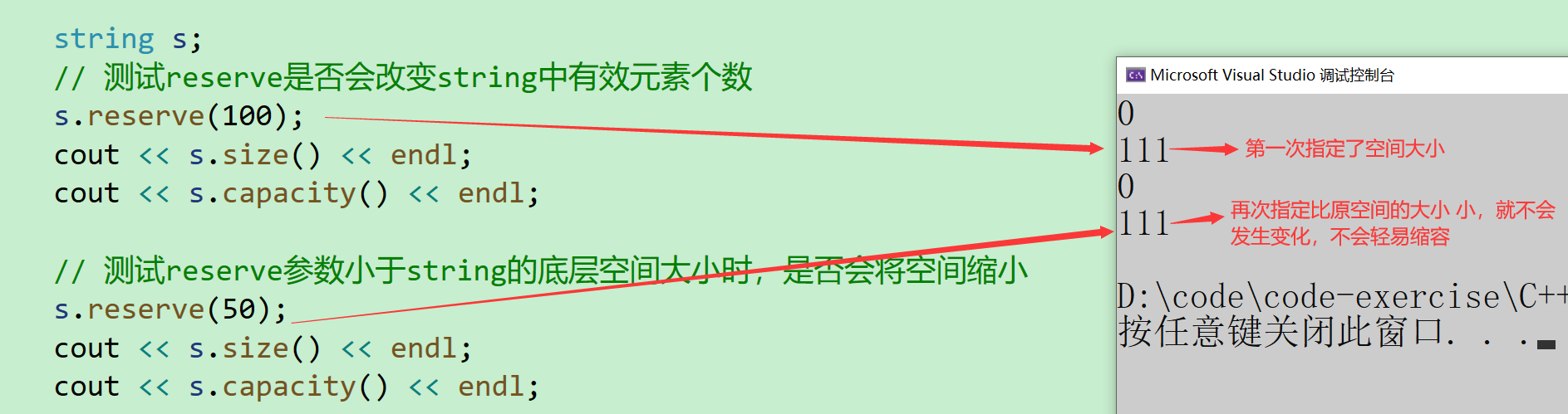 - reserve(size_t res_arg=0):为string预留空间,不改变有效元素个数,当reserve的参数小于string的底层空间总大小时,reserver不会改变容量大小。