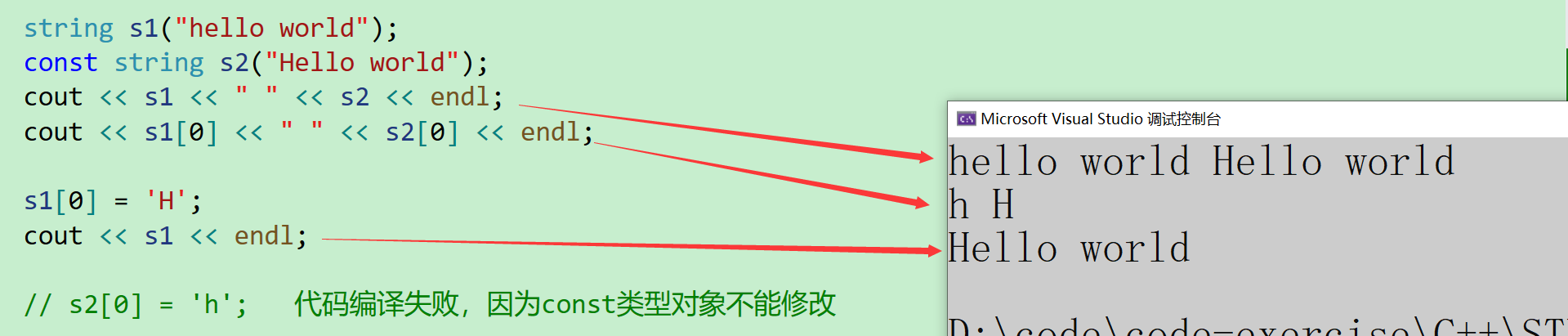 // s2[0] = 'h'; 代码编译失败,因为const类型对象不能修改