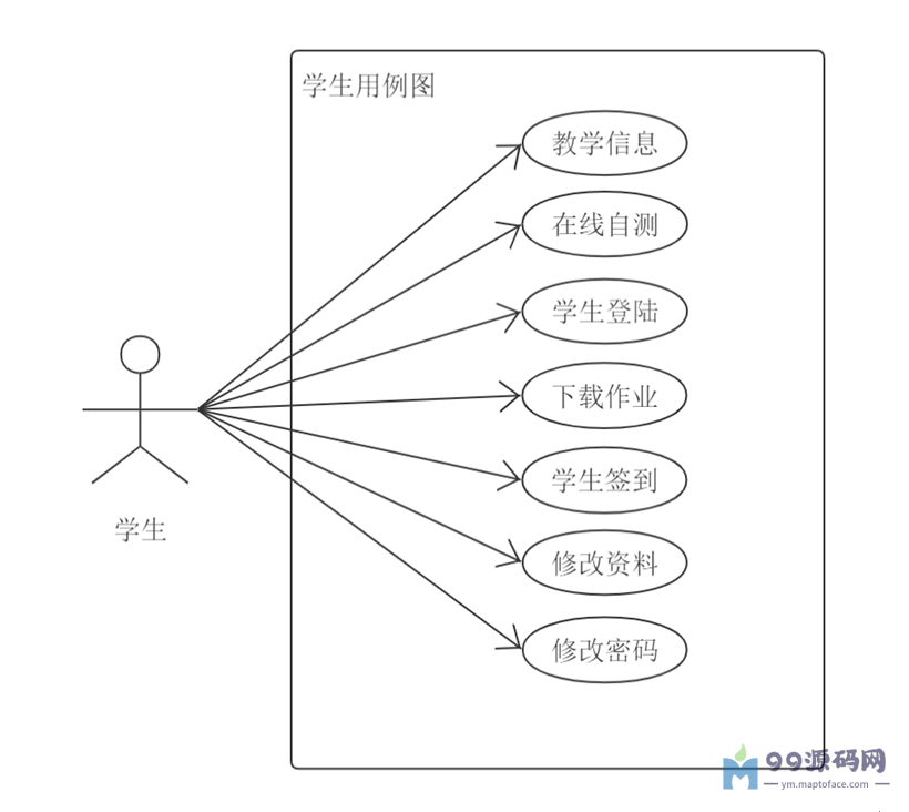 学生的功能模块主要是为学生用户设计的,包括了教学信息的查看、在线自测、学生登录、下载作业、学生签到、修改个人资料、修改密码等功能。学生用户是系统的前台主要使用人员,他们的操作数据将为系统的基础数据提供保障,学生用例图如下3-2所示。