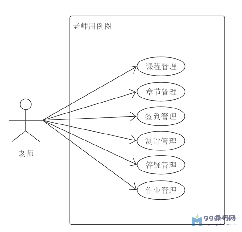 老师的功能模块主要是针对课程信息的维护和学生作业、测评的评判与打分。包括课程管理、章节管理、签到管理、测评管理、答疑管理、作业管理等功能。老师作为课程的主讲人和学生的辅导者,需要对学生的学习情况和作业完成情况进行跟踪和评估,并对学生提出问题进行答疑解惑,为学生提供更好的学习体验和教学效果,老师用例图如下3-3所示。