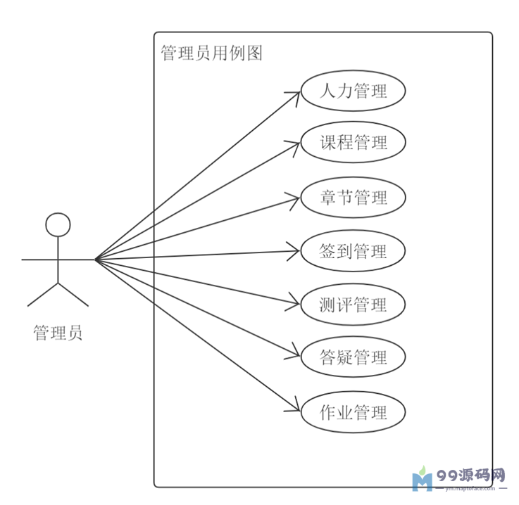 管理员的功能模块主要包括人员管理、课程管理、章节管理、签到管理、测评管理、答疑管理、作业管理等功能,管理员用例图3-1如下所示。