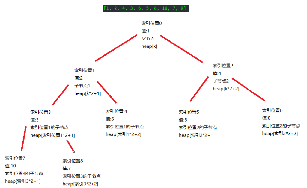 堆是一个二叉树,从图中可以明白父节点heap[k]分出左右两个叉分别是heap[k*2+1]和heap[k*2+2]