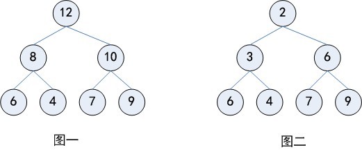 堆分为两种情况,有最大堆和最小堆。将根节点最大的堆叫做最大堆或大根堆,根节点最小的堆叫做最小堆或小根堆。下图图一就是一个最大堆,图二就是一个最小堆。在一个摆放好元素的最小堆中,可以看到,父结点中的元素一定比子结点的元素要小,但对于左右结点的大小则没有规定谁大谁小。