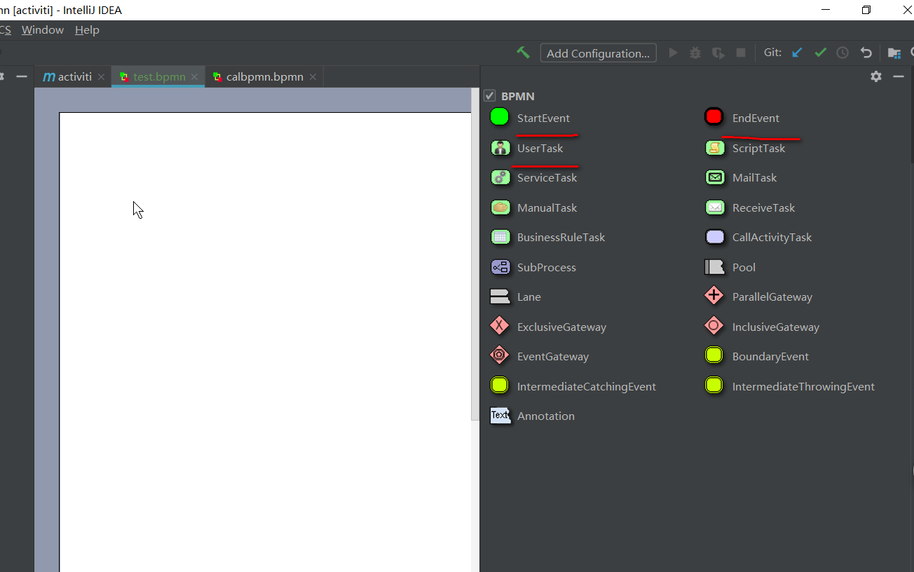 简单的使用主要包含了开始startEvent,结束EndEvent,用户任务Usertask三个按钮。。如图: