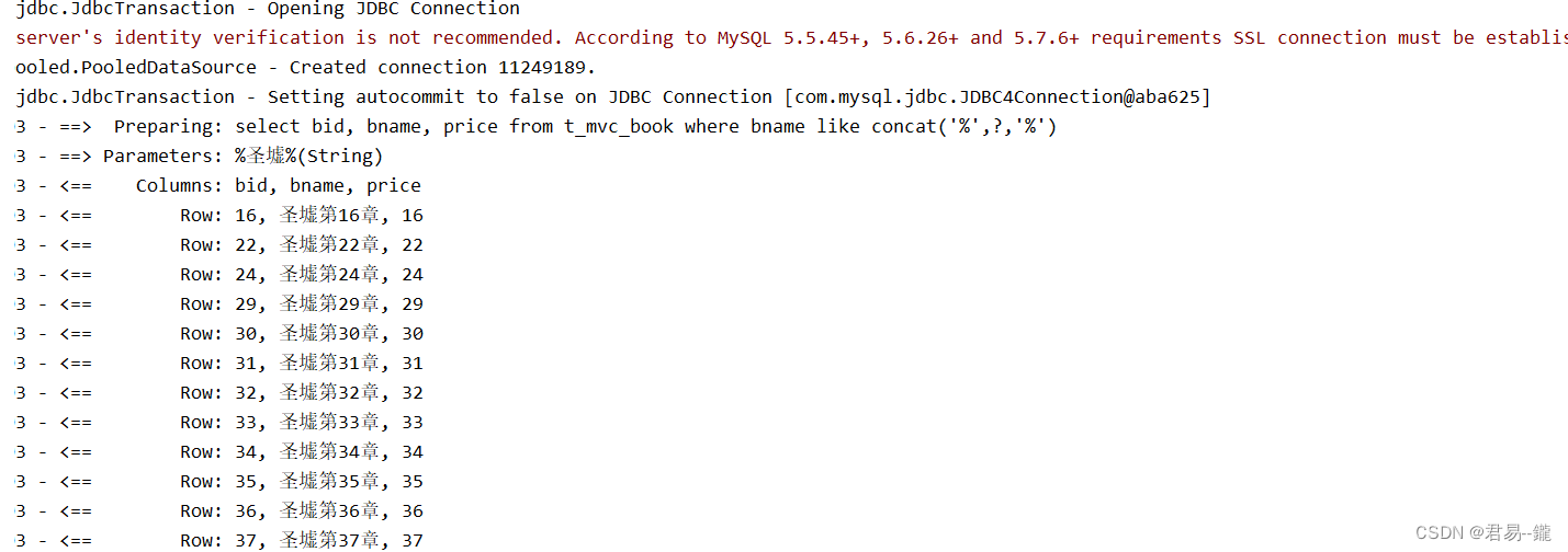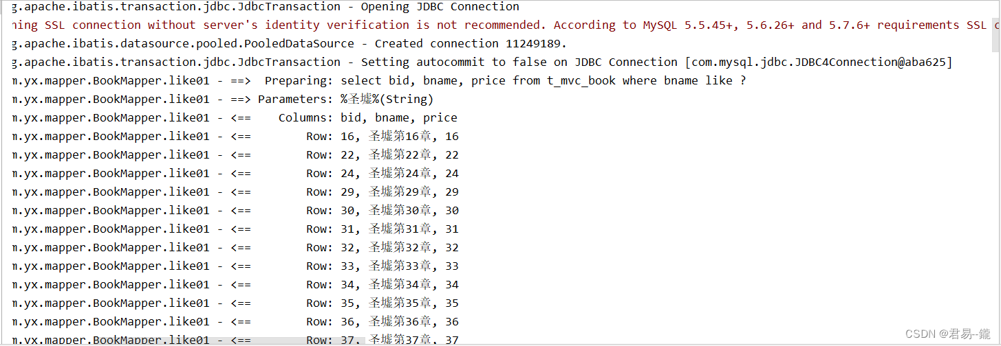 package com.yx.Demo; import com.yx.biz.BookBiz; import com.yx.biz.Impl.BookBizImpl; import com.yx.mapper.BookMapper; import com.yx.model.Book; import com.yx.untils.SessionUtil; import org.apache.ibatis.session.SqlSession; import org.junit.After; import org.junit.Before; import org.junit.Test; import java.util.Arrays; import java.util.List; /** * @author 君易--鑨 * @site www.yangxin.com * @company 木易 * @create 2023-08-21 10:26 * 测试增删改查的方法 */ public class Dmeo1 { // 实例化工具类和业务层类 private SqlSession sqlSession; private BookBiz bookBiz; @Before public void a(){ System.out.println("执行测试代码块之前会执行的初始化代码块......"); // 获取session对象 sqlSession=SessionUtil.openSession(); BookBizImpl bookBiz=new BookBizImpl(); // 获取BookMapper对象 BookMapper mapper=sqlSession.getMapper(BookMapper.class); // 将获取到的BookMapper对象添加到bookBiz中 bookBiz.setBookMapper(mapper); // 扩大作用权限 this.bookBiz=bookBiz; } @After public void b(){ System.out.println("执行测试代码块之后会执行的初始化代码块......"); // 提交数据库提交事务 sqlSession.commit(); } @Test // 测试方法 public void testlike01(){ System.out.println("测试like01方法..."); bookBiz.like01("%圣墟%").forEach(System.out::println);//jdk1.8的新特性。 } @Test // 测试方法 public void testlike02(){ System.out.println("测试like01方法..."); bookBiz.like02("%圣墟%").forEach(System.out::println);//jdk1.8的新特性。 } @Test // 测试方法 public void testlike03(){ System.out.println("测试like01方法..."); bookBiz.like03("%圣墟%").forEach(System.out::println);//jdk1.8的新特性。 } }测试结果