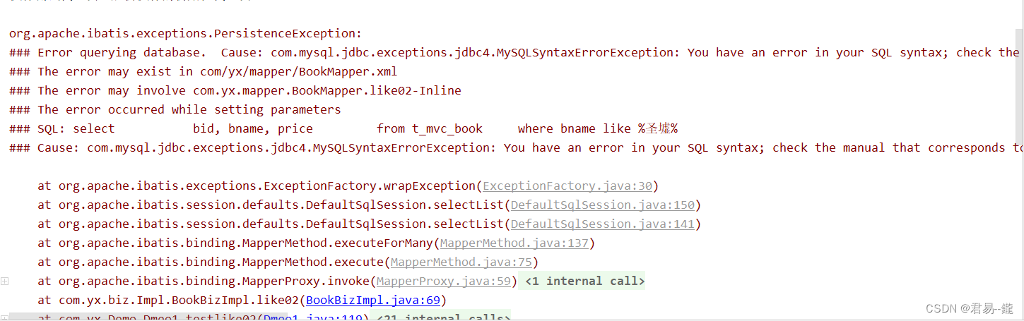 - 如果运用了$字符编写了模糊查询的方法,在方法语句体中${参数字段}未用单引号包裹则会报错,SQL编写错误如下图所示