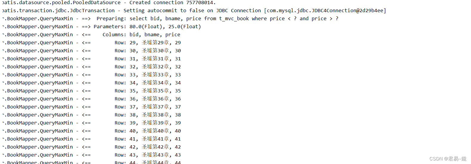 <select id="QueryMaxMin" resultType="com.yx.model.Book" parameterType="com.yx.dto.BookDto"> select <include refid="Base_Column_List" /> from t_mvc_book where price < #{max} and price > #{min} </select>控制台输出结果