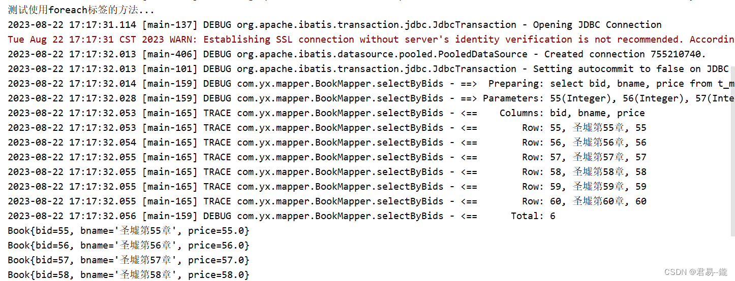@Test // 测试方法 public void testByid(){ System.out.println("测试使用foreach标签的方法..."); List<Integer> bids = Arrays.asList(new Integer[]{55, 56, 57, 58, 59, 60}); bookBiz.selectByBids(bids).forEach(System.out::println);//jdk1.8的新特性。 // 打印输出 }输出结果