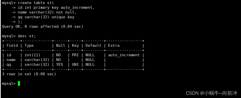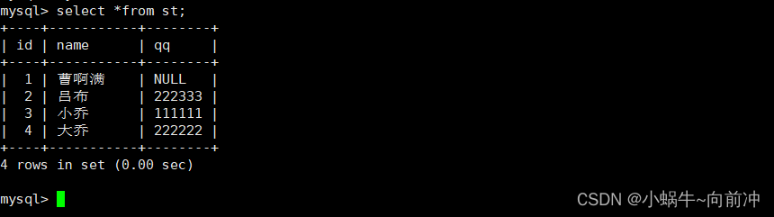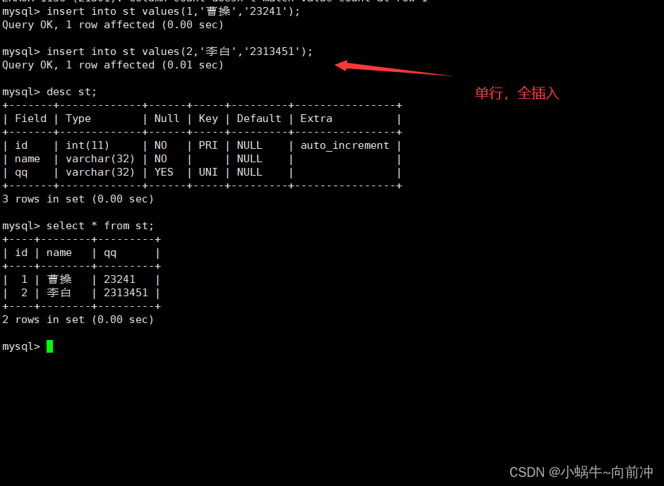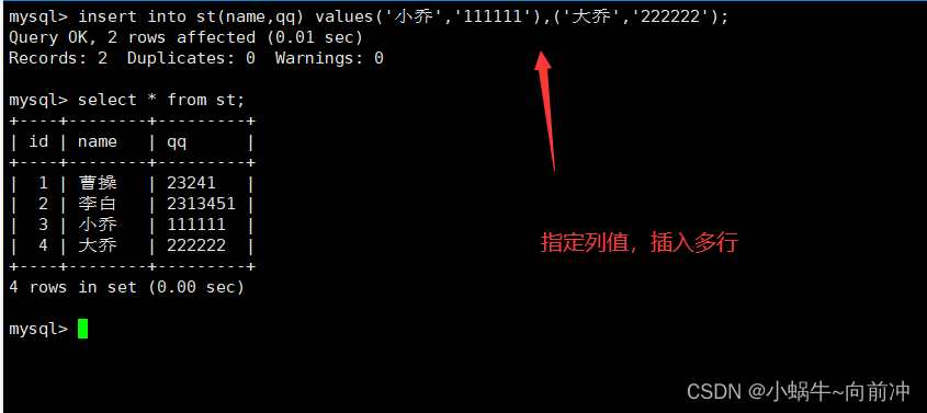 insert into st(name,qq) values('小乔','111111'),('大乔','222222');