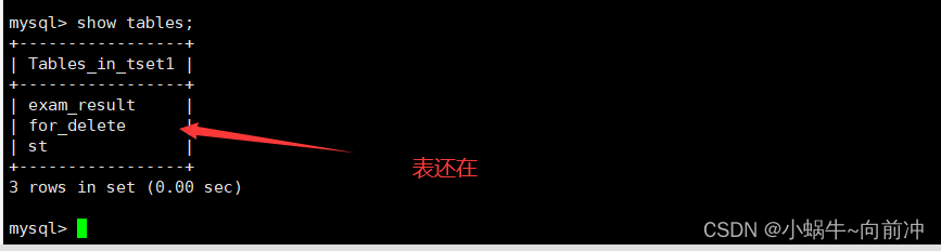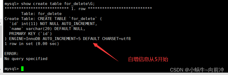 对于auto_increment = 5这说明,我们以刚刚那种方法删除表,并没有把表的信息从日志中删除,而是把表中内容清空了。