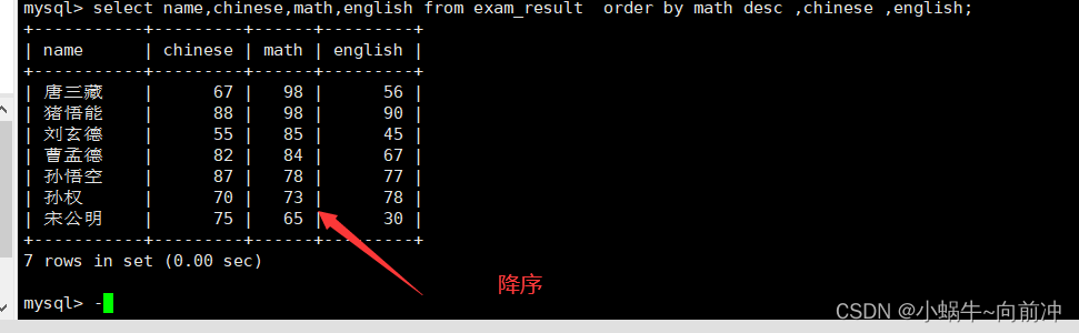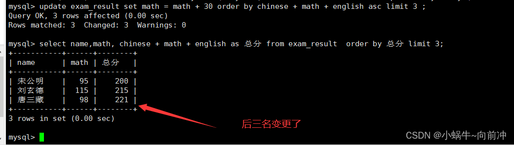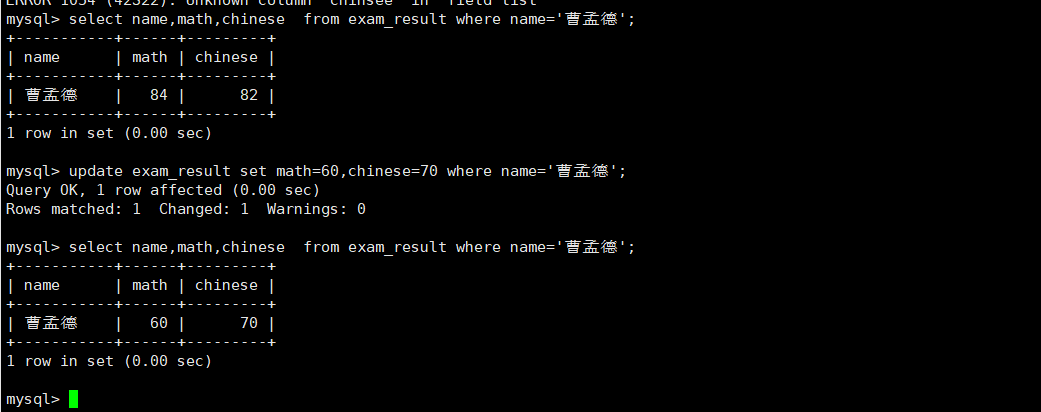 将曹孟德同学的数学成绩变更为 60 分,语文成绩变更为 70 分