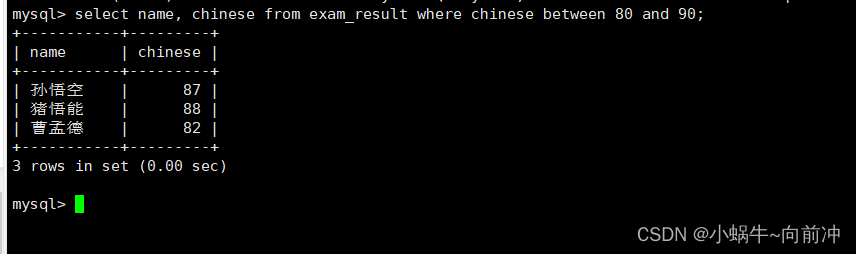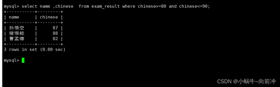 select name ,chinese from exam_result where chinese>=80 and chinese<=90;
