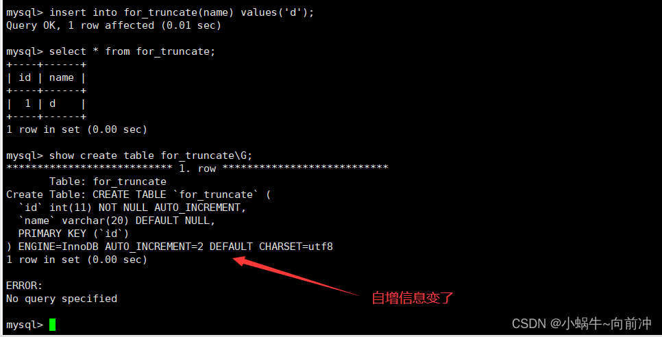 3. truncate 操作会重置 auto_increment 计数器,这意味着删除的行数不会被计入 auto_increment 的计数器中,下一次插入数据时将从 1 开始计数。
