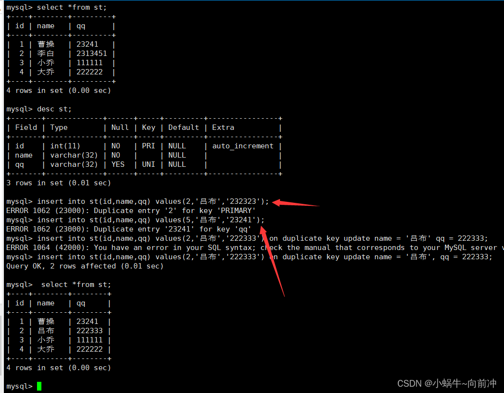 insert into st(id,name,qq) values(2,'吕布','222333') on duplicate key update name = '吕布', qq = 222333;