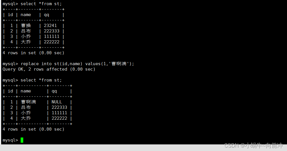 这里我们想吧李白换成吕布,但是由于id和qq是键值和唯一值改不了,但是我们可以用insert进行更新