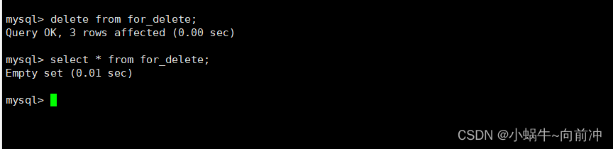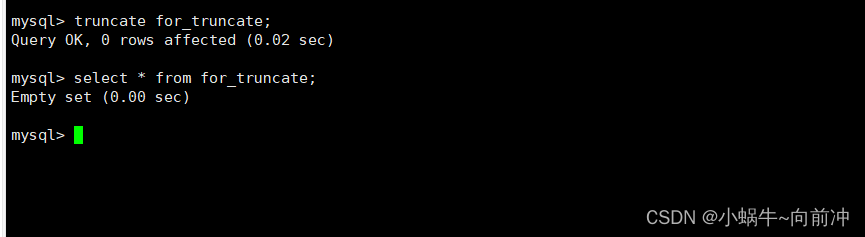 2. truncate 操作在大多数数据库系统中(包括 MySQL)是一个快速操作,因为它不会像 delete 一样逐行删除数据,而是直接删除整个表的数据。但是,由于 truncate 操作不记录在事务日志中,因此无法回滚。